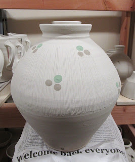 This jar has a white slip on the top half that I textured so that some of the bare clay shows through. Those little dots that are a brown/gray color are Michael Simon's black decorating pigment. I like it on this white slip because the edges go fuzzy, it doesn't keep a crisp edge. Good stuff.